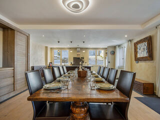 Chalet Details: Sleeps 14 adults Catering: Self catered Level 0: Living area: - Garden access - Balcony - Bar - Central fireplace - Semi-open fitted kitchen - Lounge area - Dining area - TV lounge Master bedroom: - Wardrobe and TV...