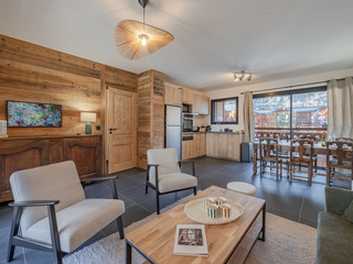 New apartment steps away from the slopes of Morzine Apartment Details: Sleeps 4 adults and 2 children Catering: Self catered Located on floor 1 Level 0: Living area: - Balcony - Open kitchen - Dining area - TV lounge Double bedroo...
