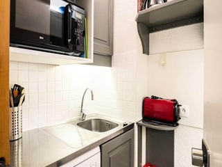 1-room studio 37 m2, on the mezzanine, north facing position. Very beautiful and modern furnishings: with 1 double sofabed (1 x 140 cm, length 190 cm), TV (flat screen), electric heating. Kitchenette (2 ceramic glass hob hotplates, toast...