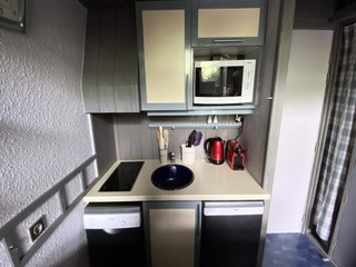 "Chalets d'Or D", 1-room studio 23 m2 on 2nd floor. Object suitable for 4 adults. Living room with 1 sofabed and 1 x 2 bunk beds, 1 pull-out bed and TV. Open kitchen (2 hot plates, dishwasher, toaster, kettle, microwave, electric coffee ...