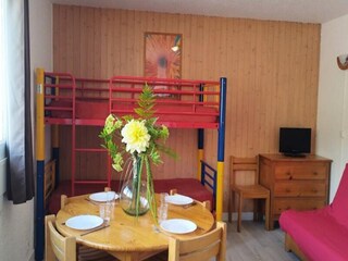 "Jardins Alpins 1", 2-room apartment 30 m2, on the ground floor. Entrance hall. Living/dining room with TV, flat screen and CD-player. 1 room with 1 french bed (140 cm). Living/sleeping room with 1 x 2 bunk beds (80 cm). Kitchenette (4 h...
