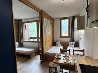 This cozy chalet-style apartment in Courchevel 1550 offers comfortable accommodation for up to 6 people. It features a living room with a sofa bed for two, a bedroom with a double bed, and a cabin area with bunk beds for two. A separate ...
