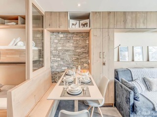 This 25m² studio apartment, ideal for up to six guests, offers convenient access to the slopes. Located on the second floor with elevator access, it features a living room with a sofa bed and a set of bunk beds, plus a separate "mountain...