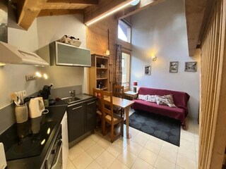 "Chalets des Cimes", 2-room apartment 30 m2. Cosy furnishings: living/sleeping room with 1 sofabed, 1 pull-out bed, dining table and TV can be hired. 1 room with 1 x 2 bunk beds. Kitchenette (2 hot plates, dishwasher, toaster, microwave,...