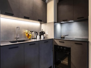 1-room studio 25 m2 on 5th floor, south-west facing position. Living/dining room with 1 sofabed (140 cm, length 190 cm), 1 double sofabed (140 cm, length 190 cm), TV. Kitchenette (oven, 2 ceramic glass hob hotplates, kettle, microwave, e...