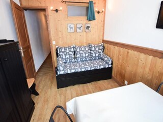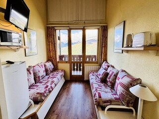 "Trois Vallées 517", 1-room apartment 33 m2 on 2nd floor, south facing position. Bright, beautiful furnishings: living/dining room with 1 pull-out bed (2 pers. 2 x 80 cm, length 190 cm), TV (flat screen), electric heater. Sleeping alcove...