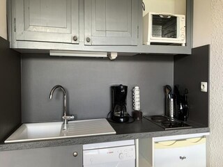 "Asters 1126 Bâtiment A2", 1-room apartment 18 m2, on the ground floor. Beautiful furnishings: living/dining room with 1 pull-out bed (2 pers. 2 x 80 cm, length 190 cm), TV (flat screen). Kitchenette (2 ceramic glass hob hotplates, kettl...