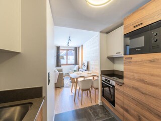 This renovated 32m² studio apartment offers a cozy and functional space for up to six guests. The habitable hall and mountain corner are furnished with two sets of bunk beds (each accommodating two people). The living room features a com...