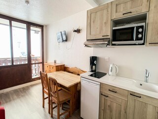 "Chalets des Cimes", 2-room apartment 30 m2. Cosy furnishings: living/sleeping room with 1 sofabed, 1 pull-out bed, dining table and TV can be hired. 1 room with 1 x 2 bunk beds. Kitchenette (2 hot plates, dishwasher, toaster, microwave,...