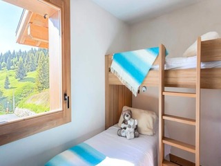 "Odalys Essentielle Le Hameau du Mottaret", 2-room apartment 30 m2. Practical furnishings: living/sleeping room with 2 beds, dining table and TV. 1 room with 3 sleeping facilities. Kitchenette (2 hot plates, dishwasher, kettle, microwave...