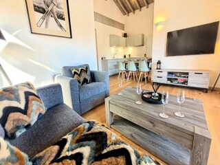 This spacious apartment features two bedrooms, one with a double bed and the other with two singles, perfect for families or small groups. The living area includes a sofa bed, two armchairs, and a dining table with seating for three. Enj...