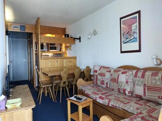 This 40 sq m, two-room apartment in Les Arcs 1800 accommodates up to six guests. It features a pull-out sofa bed in the living room, two single beds in the bedroom, and a mountain corner with bunk beds (top bunk not suitable for children...