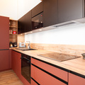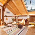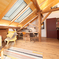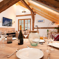 From the 1st floor a staircase leads up to the living Room / Dinning room and Kitchen. This beautiful open plan space is under the roof complete with original wooden beams. The height and two large velux windows give a feeling of space and light while the natural wood gives a sense of warmth and cosiness. From the lounge area double doors open onto a small balcony with views over to Mont Joly and the Domes de Miage.