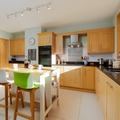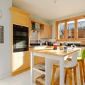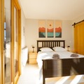 Upon entering the apartment into the large entrance hall you'll find ample storage space for your coats and boots. Off to the left is the first of the large bedrooms, a twin bedroom with an additional sofa bed. The next room from the hallway is the kitchen, a lovely, spacious and bright room and very well equipped to ensure that cooking there is a hassle-free joy. The kitchen opens out onto the living area and its large dining table with plenty of room to seat at least 8 and a great spot to enjoy the views from out of the first set of large french doors. Perfect in the summer or spring for throw open whilst you eat.