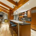 The main living level features a spacious open plan layout with two living rooms at either end. One features a wood-burning fireplace and flat screen TV while the other features a large wraparound couch, flat screen TV and a DVD/VCR player. The large open concept gourmet kitchen with heated floor and dining area separate the two living rooms. The kitchen features modern appliances, granite counters, and a breakfast bar. The dining area seats 8 comfortably with sliding door access to the deck with BBQ. The private hot tub is sunken into the lower level deck in a forested setting.