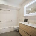 Independent bathroom with shower, double hand basin, towel dryer and separate WC.