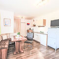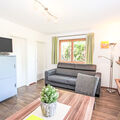 2-room apartment 44 m2, on the ground floor. Bright, cosy furnishings: entrance hall. 1 room with 1 double bed, 1 sleeping facility and satellite TV (flat screen). Living/sleeping room with 1 double sofabed (180 cm, length 200 cm), dining nook and satellite TV (flat screen), DVD. Open kitchen (oven, dishwasher, 4 ceramic glass hob hotplates, microwave, electric coffee machine). Shower, sep. WC. Underfloor heating. Terrace, patio, garden 40 m2. Terrace furniture, deck chairs. Marvellous view of the mountains. Facilities: Internet (WiFi, free). Please note: suitable for families. Non-smokers only. Private entrance, smoke alarm. The apartment is suitable for people with reduced mobility, built next to the main house and has a lot of privacy. A beautiful garden for private use is at disposal.