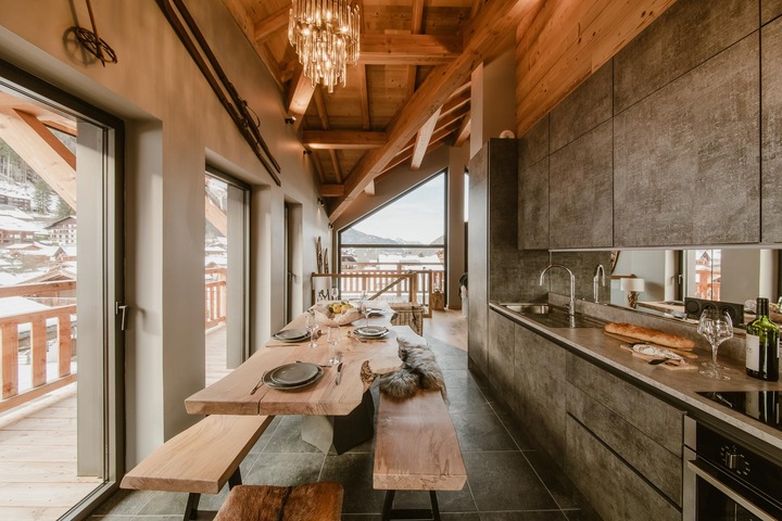 Apartment 5 spreads over two levels with two double bedrooms and a bunk room, sleeping up to six. The double bedrooms come with either a luxury King size or European King size Vispring mattress to give you the best nights sleep after a long day on the slopes. The bedrooms are located on the lower floor with the master bedroom being ensuite, whilst the second bedroom and bunk room share a second bathroom with shower and WC. The wrap around balcony on both floors offer fantastic views of the surrounding mountains and the open plan living and dining area on the upper level boasts a large wood burning stove for those cosy evenings in. Upstairs you can enjoy all the space, light and comfort in this modern apartment and soak up the views in front of the fire.