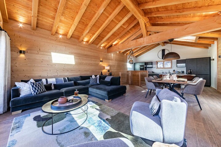 Head on up to the top floor and you’ll see the best of the chalet. A large, open plan living space welcomes you with a huge velvet sofa, dining area with super comfortable dining chairs and a state of the art kitchen any chef would be proud to cook in. This fantastic, open and bright space has windows all around and a sun trap balcony with gorgeous views of the Pleney. Enjoy a moment of peace with the sun on your skin, or an aperol with friends.