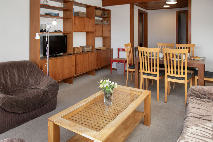 "Porthos 37", 4-room apartment 75 m2 on 2nd floor, south facing position. Practical furnishings: living/dining room with dining table and cable TV. Exit to the balcony, south facing position. 1 room, north facing position with 1 x 2 bunk beds (80 cm, length 190 cm). 1 large room, south facing position with 1 double bed (2 x 90 cm, length 190 cm). 1 small room, west facing position with 1 double bed (2 x 90 cm, length 190 cm). Exit to the balcony, south facing position. Kitchen (3 hot plates, oven, dishwasher, toaster, kettle, microwave, raclette grill, fondue Set (chinoise, cheese)). Bath/WC, sep. WC. Large balcony, south facing position. Balcony furniture, deck chairs (4). Beautiful panoramic view of the mountains and the countryside. Facilities: hair dryer. Internet (WiFi, free). Garage space n 9 at 800 m, height 215 cm. Please note: non-smokers only. Maximum 1 pet/ dog allowed. 143.403.003.10