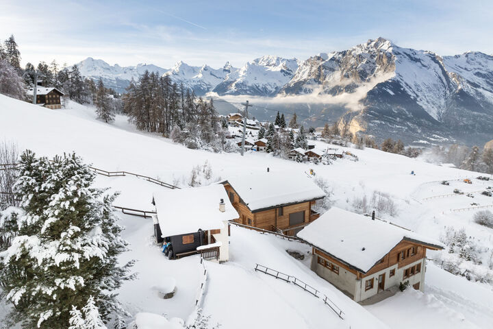 "Le Ruisseau", 3-room chalet 74 m2 on 3 levels. Fully renovated in 2015, beautiful furnishings: small living room with Scandinavian wood stove, dining nook and cable TV. Open kitchen (oven, dishwasher, 4 induction hot plates, toaster, kettle, electric coffee machine, Capsules for coffee machine (Nespresso) extra, raclette grill, fondue Set (cheese)). Shower/WC. Electric heating. On the lower ground floor: 1 room with 2 beds (90 cm, length 200 cm). 1 children's room with 1 x 2 bunk beds (80 cm, length 190 cm). Shower/WC. Top floor: open gallery with sloping ceilings, ceiling height 150 cm with DVD. Small balcony 8 m2, north facing position. Terrace furniture, barbecue, deck chairs (2). Very beautiful view of the mountains and the valley. Facilities: washing machine, dryer, hair dryer. Internet (WiFi, free). Please note: non-smokers only. Instead of an enclosed bedroom, some sleeping areas are located in an open-plan area (gallery, alcove, etc.).