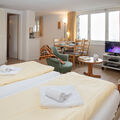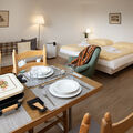 "Helene Studio Christel", 1-room studio 31 m2, on the lower ground floor. Practical and cosy furnishings: living/sleeping room with 2 beds (90 cm, length 200 cm), dining table, satellite TV and radio. Small kitchen (3 hot plates, oven, toaster, kettle, electric coffee machine, Capsules for coffee machine (Nespresso) extra, fondue Set (cheese)). Bath/shower/WC. View of the mountains. Facilities: Internet (WiFi, free). Please note: non-smokers only. Maximum 1 pet/ dog allowed.