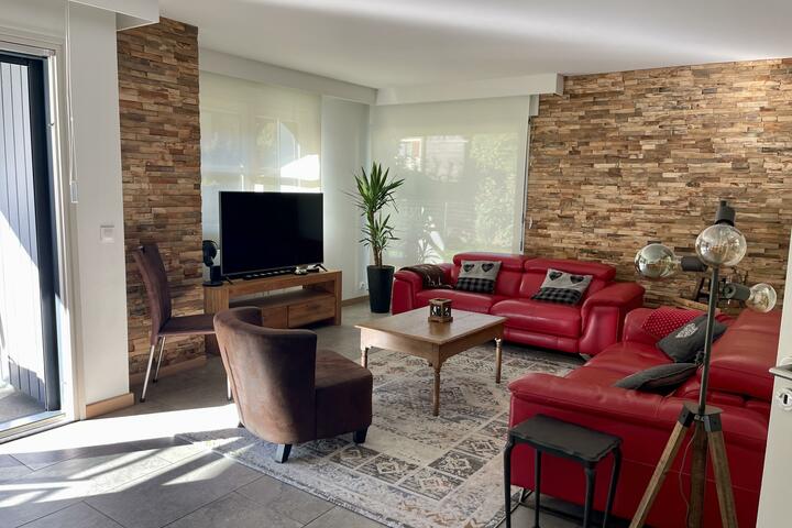 Beautiful 140m² apartment with garden sleeping 8 with its 4 bedrooms. It is located in the heart of the village of Les Houches, on the 1st floor of a modern house with garden and views of the Aiguille du Midi.