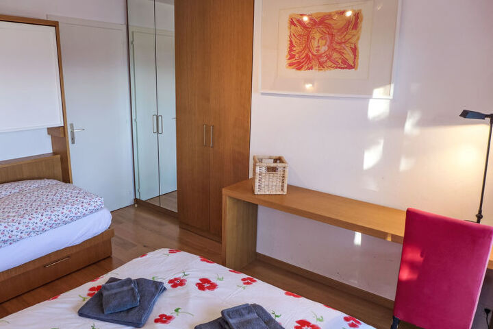 "Les Arolles B12", 3-room apartment 90 m2 on 2nd floor. Spacious, comfortable and beautiful furnishings: living/dining room with open-hearth fireplace, cable TV, flat screen, DVD and DVD collection available. Exit to the balcony, south facing position. 1 room with Dressing room with 1 double bed (160 cm, length 200 cm), hip bath/WC. 1 room with 1 bed (80 cm, length 190 cm), 1 sofabed (140 cm, length 190 cm). Exit to the balcony, south facing position. Kitchen (oven, dishwasher, 4 ceramic glass hob hotplates, kettle, freezer, electric coffee machine, Capsules for coffee machine (Nespresso) extra, raclette grill, combination microwave, fondue Set (chinoise)). Exit to the balcony, north facing position. Shower/WC. Balcony 20 m2, south facing position. Balcony furniture. Very beautiful view of the mountains and the countryside. Facilities: iron, hair dryer. Internet (WiFi, free). Garage (1 car), height 193 cm, width 220 cm. Please note: non-smokers only.