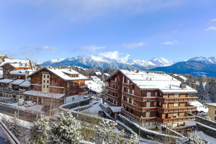 Floors are counted as levels (calculated from the bottom of the building). Apartment house "Les Arolles". In the resort 650 m from the centre of Crans, in a sunny position, 1.2 km from the lake, 900 m from the skiing area, south facing position. In the house: lift, storage room for skis, central heating system, washing machine, tumble dryer (for shared use, extra), drying room. Single garage. Shop, supermarket 700 m, restaurant 550 m, bakery 800 m, 8 minute walk to the centre, bus stop "Crans-Montana, Pas de l'Ours" 180 m, railway station "Funiculaire Montana Gare" 2.6 km, bathing lake "Moubra" 1.8 km. Golf course (18 hole) 1.1 km, tennis 1.8 km, indoor tennis centre 1.8 km, skisport facilities 900 m, ski bus stop 180 m, cross country ski track 1.1 km, ice rink 1.8 km. Well-known lakes can easily be reached: Etang Long 1.2 km, Etang Grenon 1.3 km. Hiking paths: Bisse du Ro 1.4 km. Please note: ski bus (free of charge).
