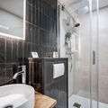 Bathroom 1: Shower, Towel dryer, Single hand basin, and Toilet