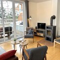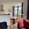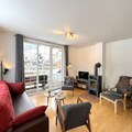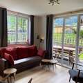 The apartment is on the ground floor and features a lovely living room with a fireplace and sofa bed, a fully equipped kitchen, a spacious bedroom, and a bathroom. A covered garage with one parking space per apartment is located below the building. The apartment also offers a ski storage room with boot warmers, a washing machine and dryer, and a terrace with direct access to a large, south-facing garden.