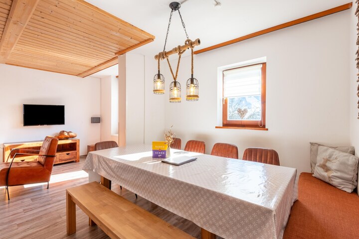 The holiday home offers a large living room with dining table and a fully equipped kitchen, both furnished in Austrian style, 6 spacious bedrooms, 6 bathrooms and a complete terrace with barbecue. Relax in your own private sauna (bathrobes and sauna towels are provided), which is located in the garden. The house also has a ski storage room, a washing machine and plenty of parking spaces.