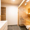 Living room(TV(satellite), seating area), open kitchen(electric kettle, toaster, cooker(ceramic), coffee machine(filter), oven, microwave, dishwasher, fridge-freezer), bedroom(double bed), bedroom(single bed, double bed), bathroom(shower, sauna, washbasin, toilet, hairdryer), Internet access, balcony, parking