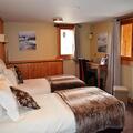 Bedroom 7 bedding is a luxury bedroom with a queen bed (180 x 200) and a child’s bed (90 x 190) in a mezzanine area with shower & toilet, plus a TV. The bedroom has access to a terrace with a view over Mont Blanc and connects with bedroom 6 terrace.