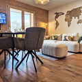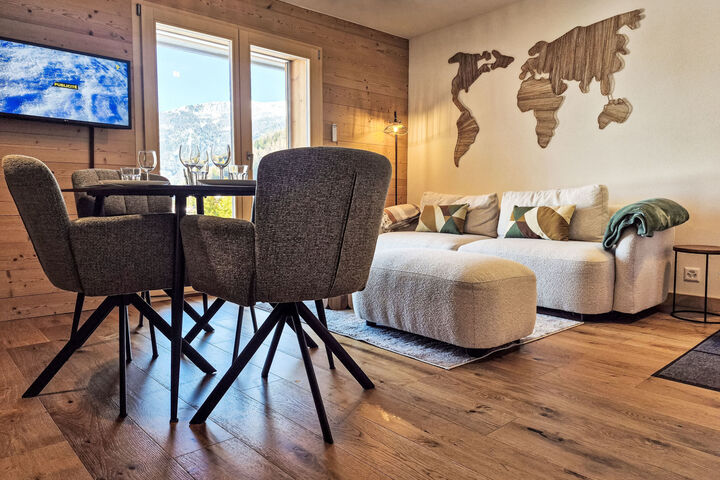 "Beauregard 1", 2-room apartment 46 m2, on the ground floor, east facing position. Object suitable for 2 adults + 2 children. Fully renovated in 2025, comfortable and beautiful furnishings: living/dining room with cable TV. Exit to the terrace, east facing position. Open alcove with 1 x 2 bunk beds (90 cm, length 200 cm). 1 room with 1 bed (160 cm, length 200 cm). Open kitchen (oven, dishwasher, 4 induction hot plates, toaster, kettle, electric coffee machine, Capsules for coffee machine (Nespresso) extra, raclette grill, fondue Set (cheese)). Shower/WC. Underfloor heating. Parquet floors. Terrace, east facing position. Terrace furniture. Beautiful view of the mountains and the valley. Facilities: washing machine, dryer, hair dryer. Internet (WiFi, free). Parking (1 car). Please note: non-smokers only. Instead of an enclosed bedroom, some sleeping areas are located in an open-plan area (gallery, alcove, etc.).
