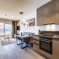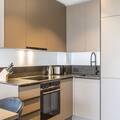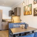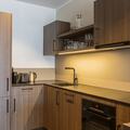 The fully equipped kitchenette includes all necessary utensils, a ceramic cooktop, oven, refrigerator with freezer compartment, and dishwasher, along with a toaster, kettle, and Nespresso coffee machine. A small starter kit with dishwashing tabs, detergent (20ml), a sponge, trash bags, and cleaning and dish towels is provided upon arrival.