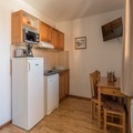 The living room includes two single sofa beds and a TV for relaxing après-ski. A separate bedroom offers a cozy bunk bed setup, while the bathroom provides a bathtub and hairdryer. Step onto the private terrace for stunning mountain views.