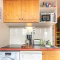 The open-plan electric kitchen is fully equipped with a refrigerator, microwave, oven, dishwasher, coffee machine, toaster, and all necessary dishes and utensils. Whether you're preparing a hearty breakfast or a cozy dinner, everything you need is at your fingertips. This apartment is a wonderful choice for a relaxing and memorable mountain getaway in Chamrousse.