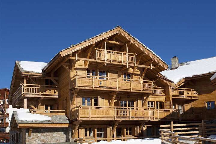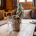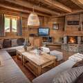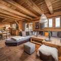 The interior of the chalet is lovingly designed, with stone and wooden walls in keeping with classic alpine architecture, as well as high vaulted ceilings. Spread over 4 floors, the chalet has 7 bedrooms, each with en-suite bathrooms and direct access to a balcony. The kitchen is located next to the open plan living and dining area, with a large stone fireplace as the focal point of the room. The fireplace is surrounded by a large corner sofa, which provides a cosy place to relax watching TV or playing cards with family or friends. In the dining area there is a beautiful solid wood table where all guests can sit.
