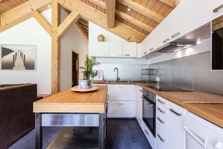 On the 1st floor: Kitchenette(electric kettle, toaster, cooker(induction), coffee machine(cups, filter), oven, microwave, dishwasher, fridge-freezer, tumble dryer, washing machine), Living/diningroom(double sofa bed, TV), Bedroom with bathroom(double bed(160 x 200 cm), shower(walk-in shower), toilet), balcony