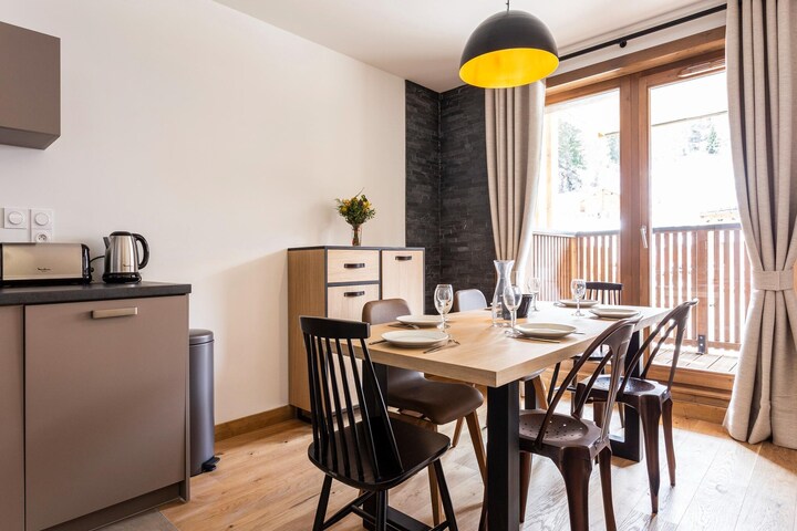 Nestled in the heart of the resort, this charming apartment offers the perfect blend of comfort and convenience for a memorable ski holiday. Located in the serene and picturesque village of Plagne 1800, known as the "nest of La Plagne," you’ll enjoy easy access to the vast Paradiski ski area. With 425 km of ski slopes and France's only bobsleigh and skeleton track, adventure awaits at every turn.