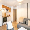 The apartment features a fully equipped kitchen with induction cooking, including a refrigerator, microwave, oven, freezer, dishwasher, and all necessary kitchen utensils. Whether you're preparing a quick snack or a full meal, everything you need is at your disposal. The cozy living space also includes a TV for entertainment.