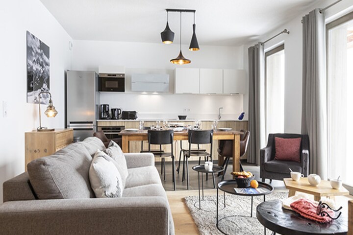 Living room(double sofa bed(140 x 200 cm), TV(flatscreen), seating area), open kitchen(hob(ceramic), electric kettle, toaster, coffee machine, oven, microwave, dishwasher, fridge, dishes and cutlery), bedroom(double bed(180 x 200 cm)), bedroom(single bed(80 x 200 cm), single bed(80 x 200 cm)), bathroom(shower, toilet), toilet(toilet), balcony or terrace