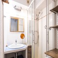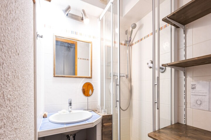 The apartment has a cabin area with two single beds (90x190), a mezzanine with a double bed (140x190), and a bedroom with two single beds (90x190). The modern bathroom features a shower, towel dryer, and separate WC. Additional amenities include WIFI, a washing machine, and a ski locker (N°404). There is also a public parking area for easy and secure parking.