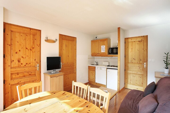 Kitchenette(cooker(4 ring stoves, electric), coffee machine, microwave, dishwasher, fridge), Living/bed room(double sofa bed), sleeping cabin(bunk bed), bathroom(shower, toilet), ski storage(shared entrance), balcony, swimming pool(shared with other guests, heated)