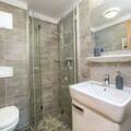 The living room has a TV and the open-plan kitchen features a dishwasher and an oven. There are two bedrooms, one with a double bed, a bunk bed and an en-suite bathroom with shower and toilet. The second bedroom has a double bed. The second bathroom also has a shower and toilet.