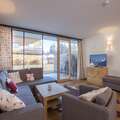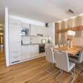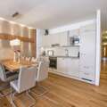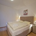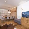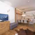 Your apartment is located on the ground floor and has a spacious living room with open plan kitchen. There are two bedrooms with a shared bathroom and one bedroom with an en-suite bathroom. Complete luxury! From your terrace, you have a wonderful view of the surrounding mountains. To relax, you can use the wellness section of the resort, where you have access to a lovely herbal sauna, Finnish sauna, heated benches, and wonderful 'schneckendouches'.