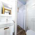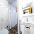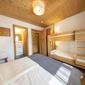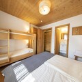 On the 1st floor: bedroom(bunk bed), bedroom(double bed), bedroom(double bed), bathroom(shower, washbasin, toilet), bathroom(shower, washbasin, toilet), balcony, garden, garden furniture, heating