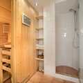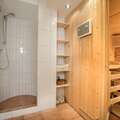 Basement: bedroom(double bed), bedroom(double bed), bedroom(double bed, bunk bed), bedroom(double bed, bunk bed), bathroom(shower, washbasin), bathroom(shower, sauna, washbasin), Landing(toilet), storage(tumble dryer, washing machine)