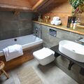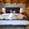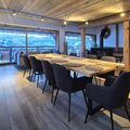 At the heart of the chalet lies an expansive 70m² open-plan living and dining area, framed by double-height ceilings and a spectacular 10-metre wall of glass doors. Flooded with natural light, this space opens onto a south-facing balcony with panoramic mountain views. A striking double-sided wood burner anchors the room, creating a warm and inviting atmosphere shared between the lounge and dining area.